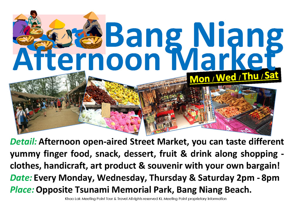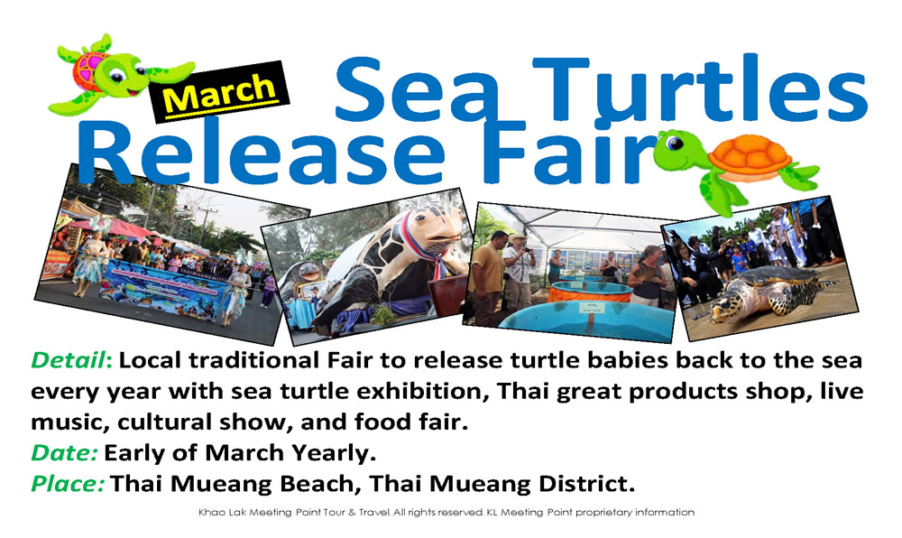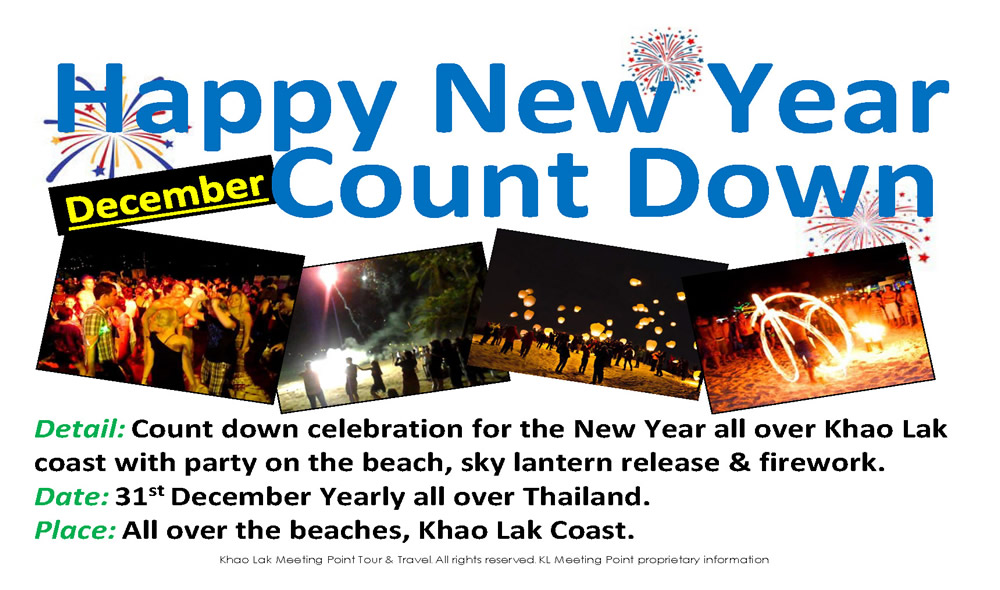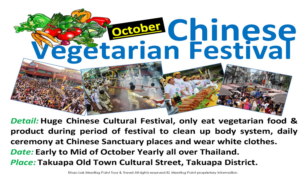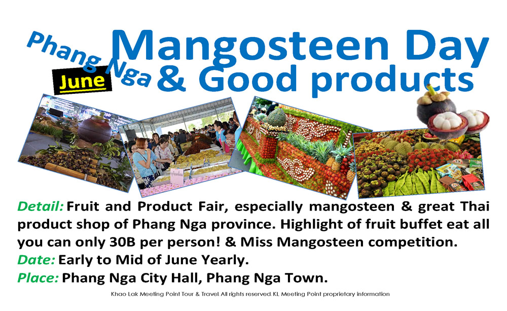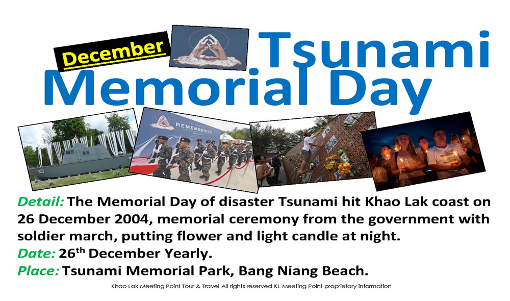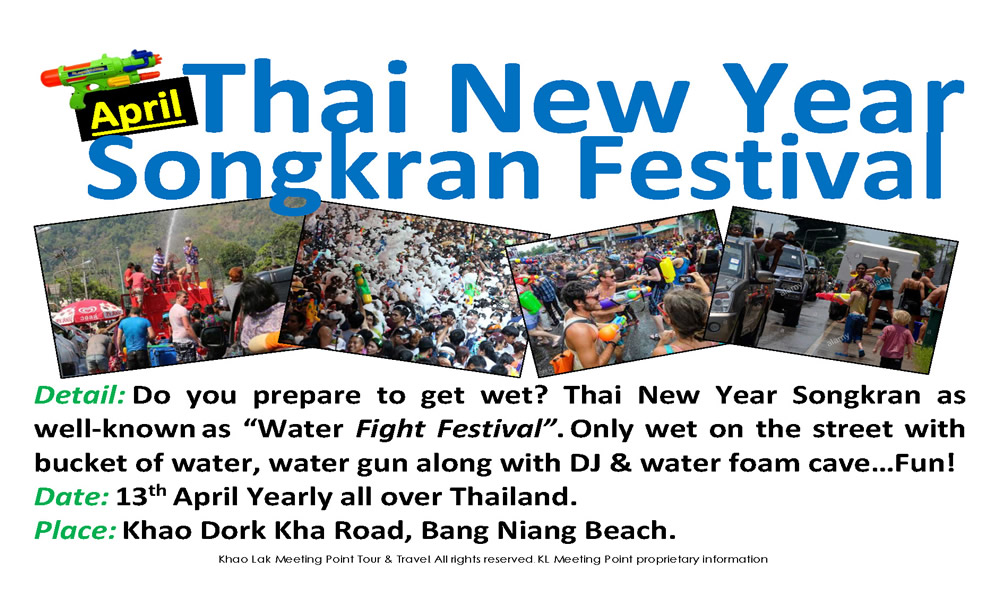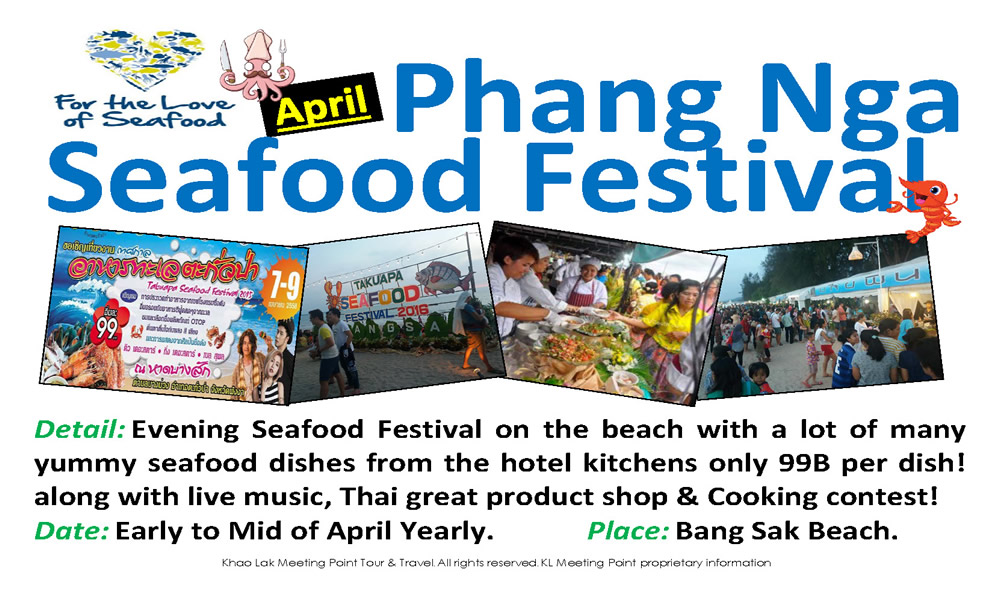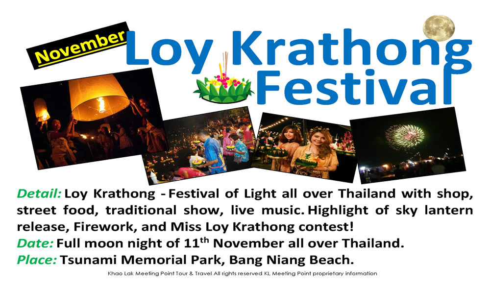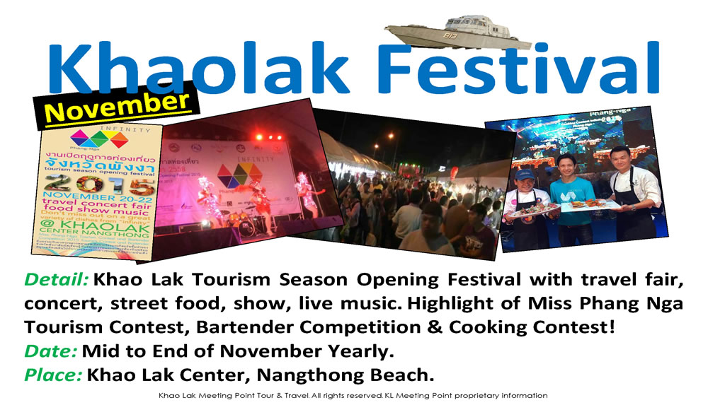When you are around Khao Lak area! Our green 20km long coast & different 7 beaches are the favourite spots for Khao Lak visitors to enjoy beach relaxing and great Exploring Day at our Khao Lak National Park and Marine National Park Islands. Also varieties of Nation & Local Festival, Events and Activities are happening surrounding our cosy area; |